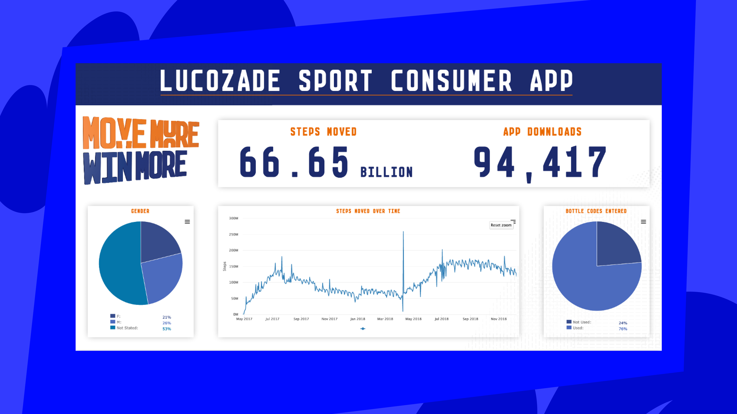 The app recorded over 94,417 downloads and more than 66 billion steps, with live dashboards providing Lucozade Sport with real-time data on user activities, demographics, download metrics, and device usage. After a successful campaign, Lucozade Sport decided to end the app on a high note to focus on new projects. We celebrated our achievements by creating a goodbye page on the Lucozade Sport website, highlighting the app’s success and user accomplishments.